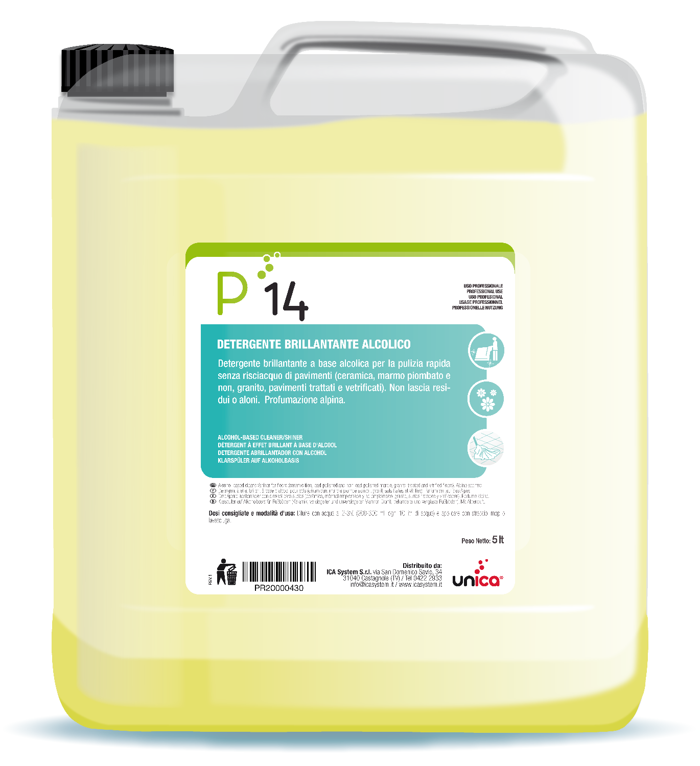 Detergente brillantante per la pulizia rapida senza risciacquo di tutti i tipi di pavimento (ceramica, marmo piombato e non, granito, pavimenti trattati e vetrificati). Non lascia residui o aloni. Diffonde nell’ambiente una gradevole e persistente profumazione alpina.
