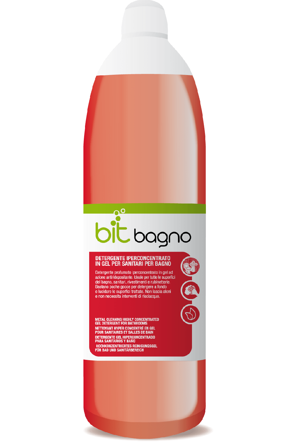 Detergente profumato iperconcentrato in gel ad azione antiridepositante. Ideale per la detersione di tutte le superfici del bagno, sanitari, rivestimenti e rubinetterie.