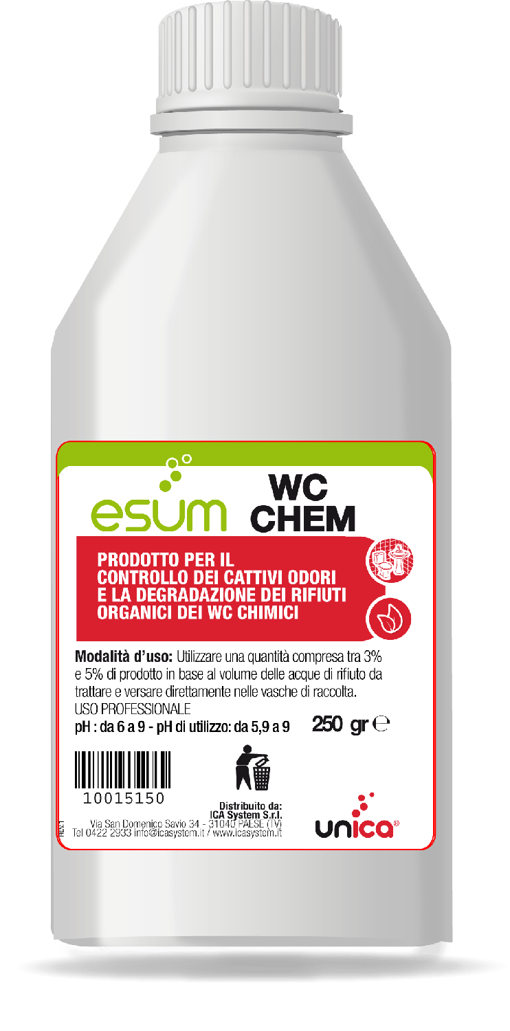 ESUM WC CHEM contiene inoltre un profumo e un tensioattivo biodegradabili e degli organismi specializzati nel combattere i cattivi odori dei rifiuti sopraffacendo i batteri responsabili degli stessi.