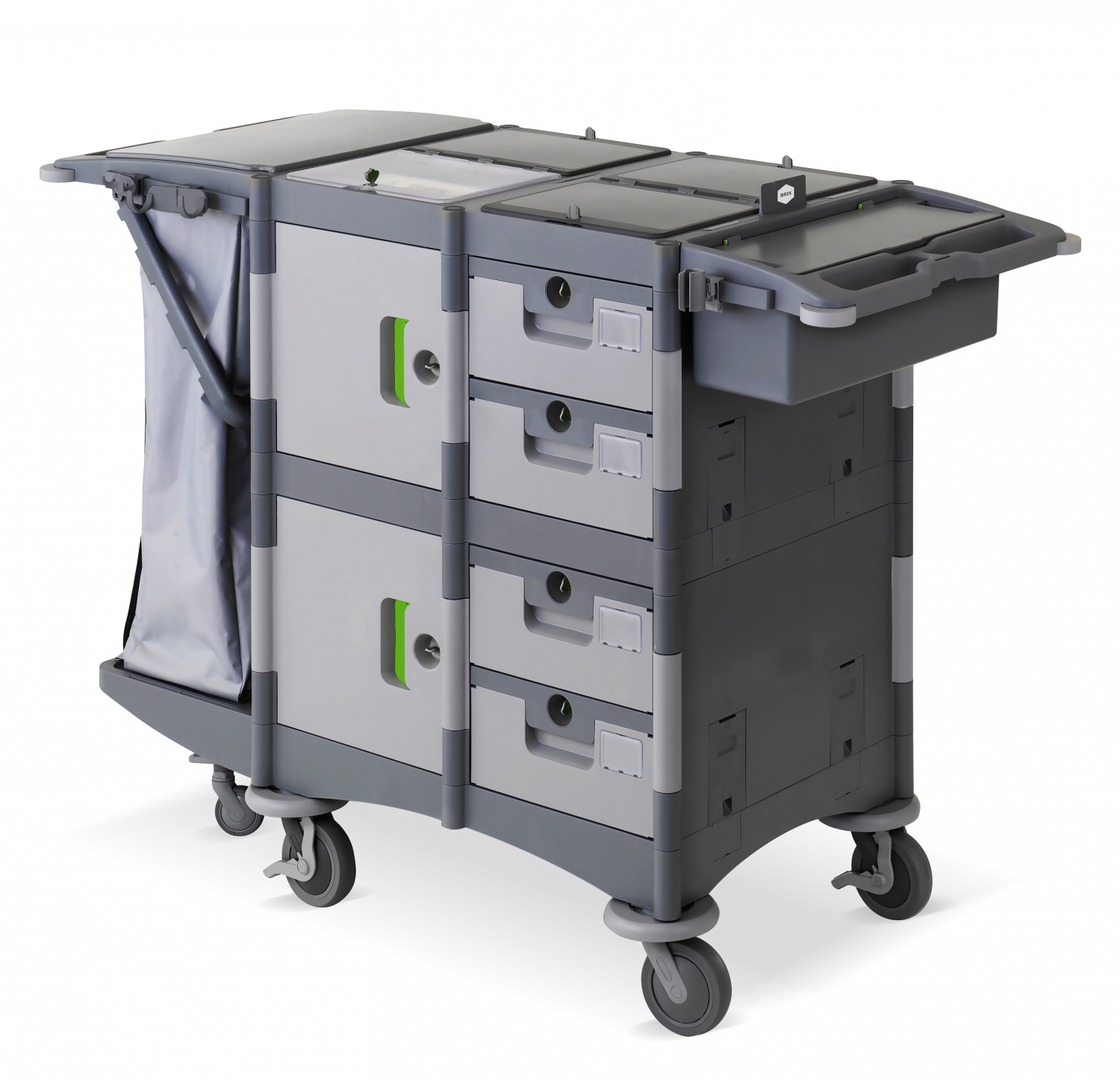 Ampi cassetti da 20 litri per l’alloggiamento dei mop da impregnare, pratica vaschetta estraibile, chiusura a chiave degli scomparti per contenere in sicurezza oggetti e prodotti chimici.