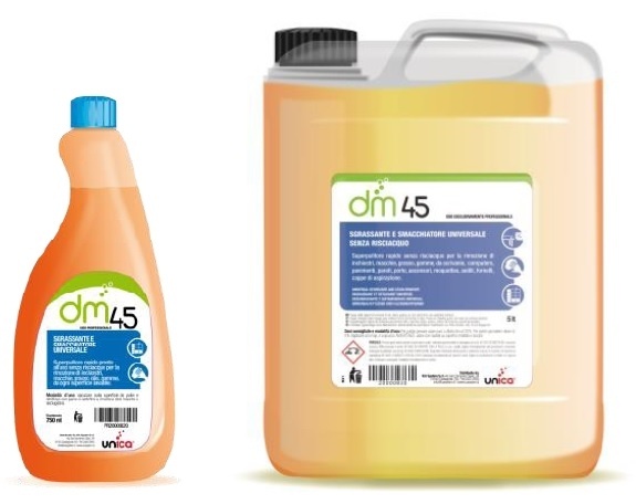 Nel caso di superfici a diretto contatto con alimenti si consiglia di risciacquare. Nel caso di superfici verniciate, smaltate o laccate verificare preventivamente l’azione di DM 45 su una porzione nascosta. Nel caso di una insufficiente resistenza della vernice, diluire DM 45 secondo necessità. USO PROFESSIONALE